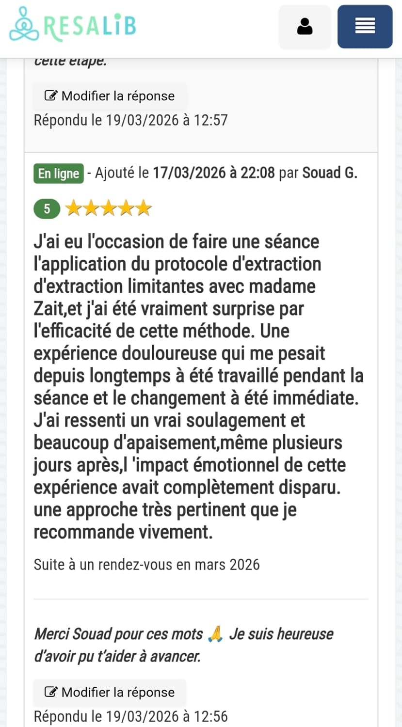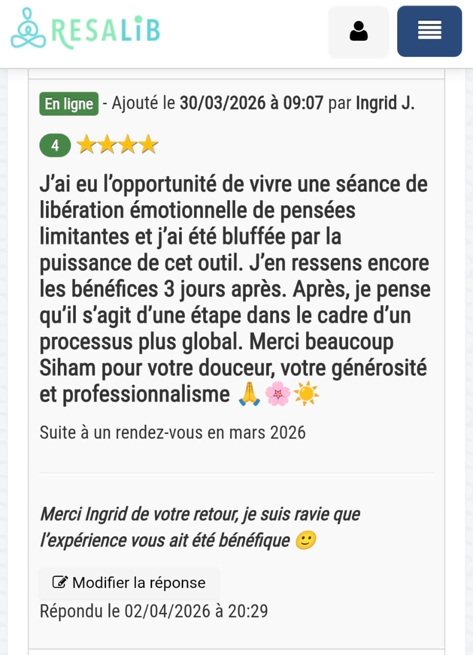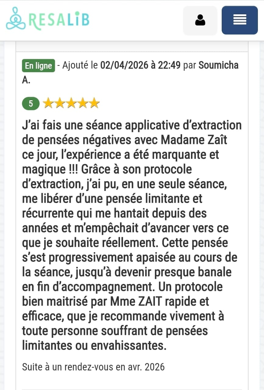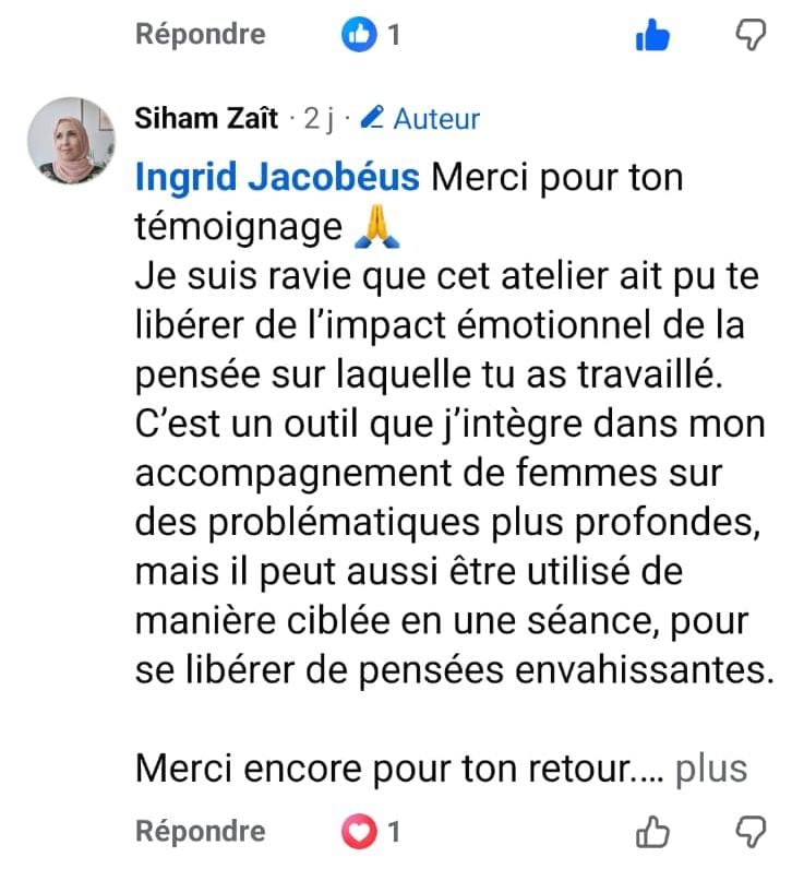 Ce travail est conçu pour aller à la racine. Et une seule séance suffit à créer un vrai déclic. Ce qui est certain, tu repartiras sans cette pensée limitante qui te freine au quotidien. Et si tu n'es pas satisfaite, tu es remboursée intégralement (ce qui n'est pas encore arrivé).