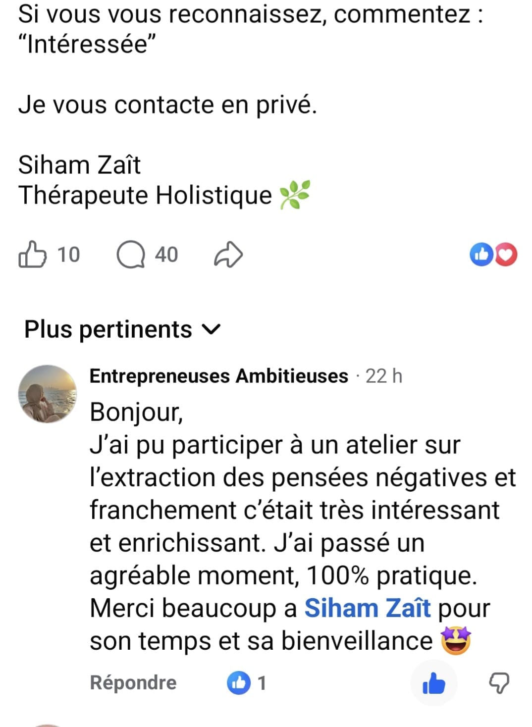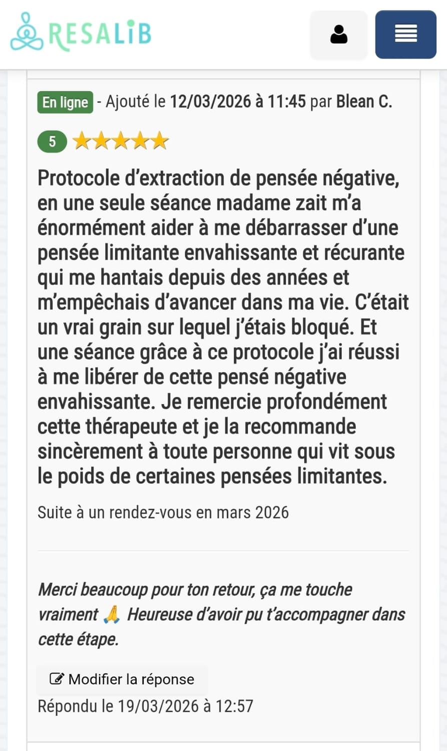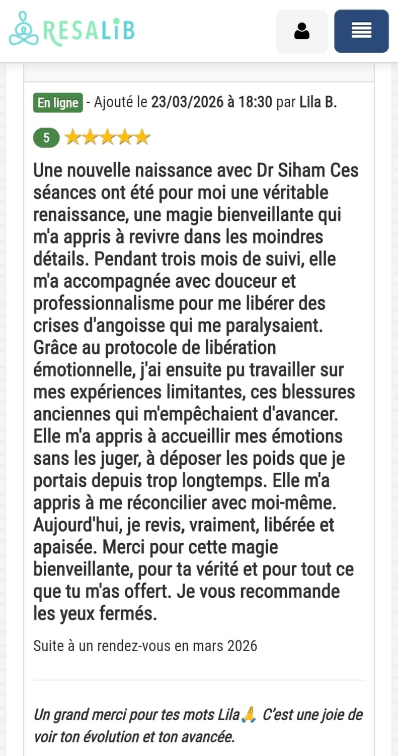 Ce travail est conçu pour aller à la racine. Et une seule séance suffit à créer un vrai déclic. Ce qui est certain, tu repartiras sans cette pensée limitante qui te freine au quotidien. Et si tu n'es pas satisfaite, tu es remboursée intégralement (ce qui n'est pas encore arrivé).